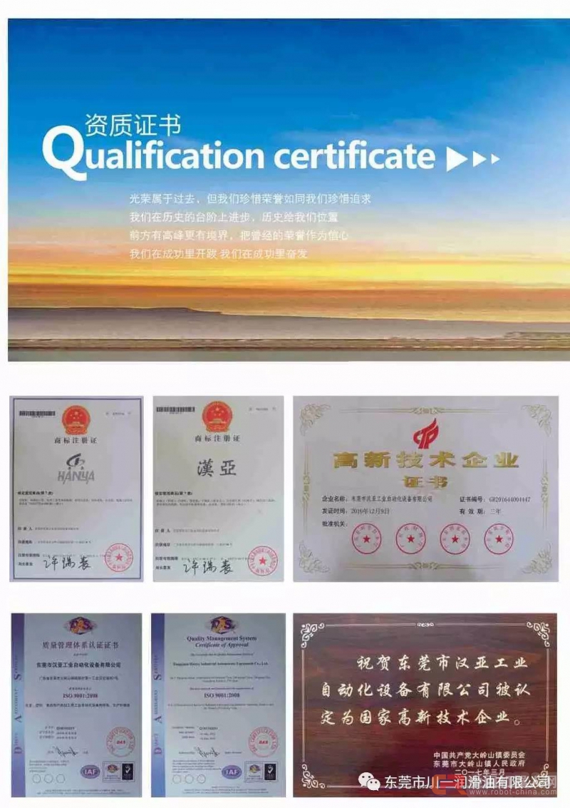 東莞市漢亞工業(yè)自動(dòng)化設(shè)備有限公司是一家民營高科技企業(yè),成立于2010年。作為在川一潤滑油公司客戶基礎(chǔ)上發(fā)展起來的新興實(shí)用型自動(dòng)化設(shè)備公司,東莞市漢亞工業(yè)自動(dòng)化設(shè)備有限公司目前擁有高級(jí)專利12個(gè)。